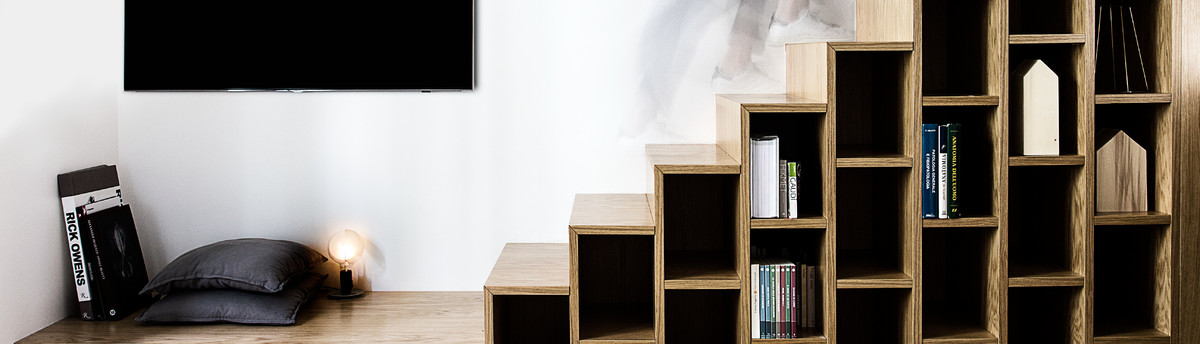 Realizzando una pannellatura mobile che si sviluppa per tutto il corridoio (dal soggiorno-sala da pranzo fino alla zona notte), prende vita uno spazio capace di ospitare: