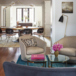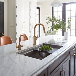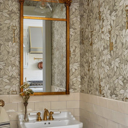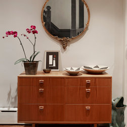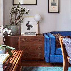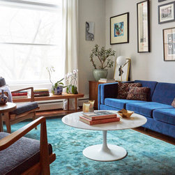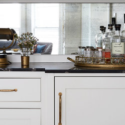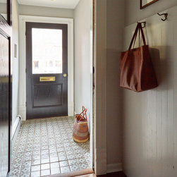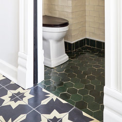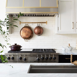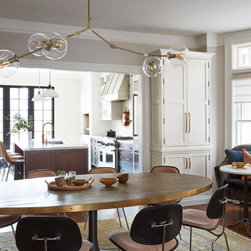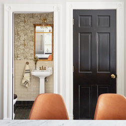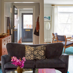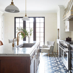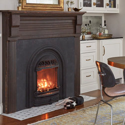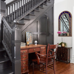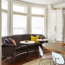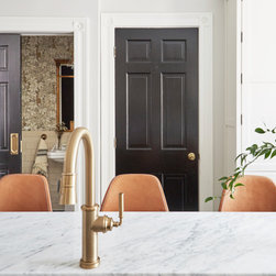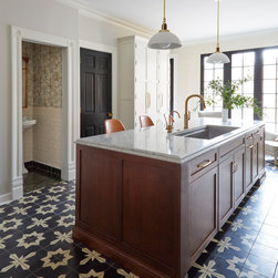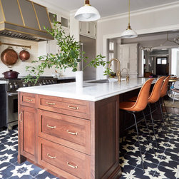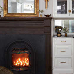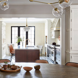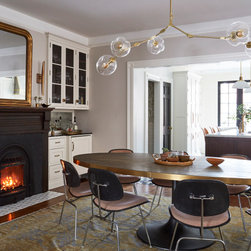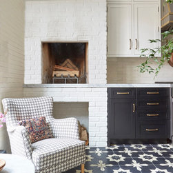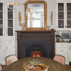 This Victorian rowhouse located in Chicago’s in Hyde Park had seen many lives prior to our clients purchasing the home – it had even been a boarding house at one point. Some of the character had been stripped during prior remodels, but we were able to add much of it back in, by opening the choppy kitchen to the dining room and adding a cased opening to match the one from the dining room to the living room. The clients are both professors at University of Chicago with a daughter and do a lot of entertaining. The clients hired KitchenLab Interiors since we specialize in vintage renovations and because we’re nuts and love a challenge! They wanted a fireplace or wood burning stove in the kitchen, and that’s not an easy thing to accomplish in Chicago. Our love for space planning really shines on this project! We relocated the powder room (incorporating gorgeous emerald green Zellige hex floor tile, moved the door to the back deck, and added a wall of windows to the back yard. While designing the dining room we were able to get back an old fireplace that had been sealed up - complete with a vintage wood surround sourced at an architectural salvage shop and hand painted terra cotta hearth tile. We added built-ins to the huge dining room, both flanking the fireplace and the bay window on the other side of the room. Vintage rugs, bespoke lighting, and vintage furniture mixed in with some new pieces and some of the client’s existing furniture pull it all together. The project also included new rugs and accessories in the upstairs den and master bedroom, and a renovation of their daughter’s 3rd floor bathroom. Custom cabinetry, finishes, fixtures and furnishings provided by KLI.