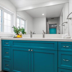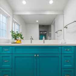 The room resonates with youthful energy and sophisticated touches. At its heart is the single sink vanity that brilliantly incorporates dual water faucets, ensuring both kids have their space during the morning rush. Painted in a captivating teal hue named ‘Silk Sari’, the vanity is both a statement piece, but a touch of modern. Above, a full wall vanity mirror stretches from end to end, creating a feeling of depth and ensuring every angle is reflected.