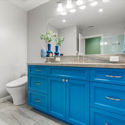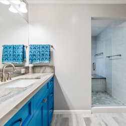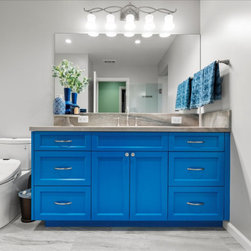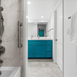 Upon entering, your eyes are immediately drawn to the single sink vanity painted in a captivating shade of blue named “Tiny Bubbles’. Above the vanity, a large single mirror amplifies the space, adding depth and reflecting the room’s exquisite design details. This piece not only adds a splash of color but is also a nod to a modern design element, offering both storage and style.
