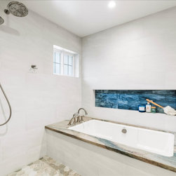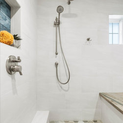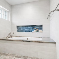 Journeying further into this sanctuary, you’re met with a pristine glass door leading to a palatial shower room. Dominating this space is the grand undermount tub, inviting relaxation and respite after long days. The shower floor is a work of art, adorned with oyster natural hexagon mosaic tiles, creating a textured contrast to the rest of the room. Along the wall, a generous niche comes alive with titles that dance in varying shades of blue, reminiscent of delicate watercolors. For added convenience, a shower niche offers a perfect space for toiletries, and a tiled footrest ensures comfort during your daily rituals.