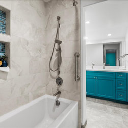 Where once stood the upper-level master suite now emerges as a vibrant and functional Jack and Jill bathroom, tailored perfectly for two. This clever design allows both children to access the bathroom directly from their respective bedrooms, ensuring convenience and privacy.