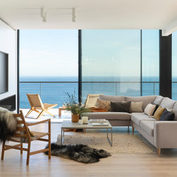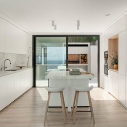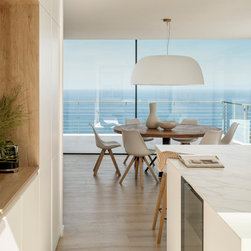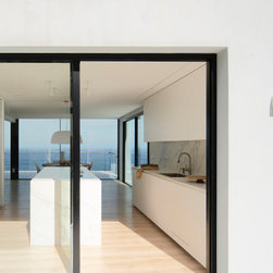 The kitchen and the living room share the same space without visual or physical barriers, extending the horizon towards the sea from any point.
