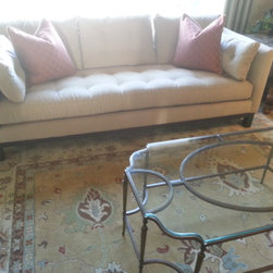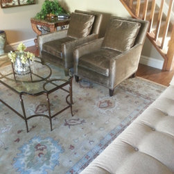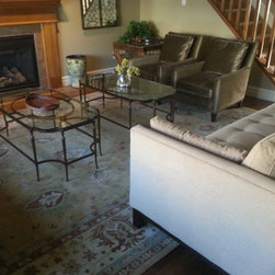 Hellenic Rug with Stanley Soiree Cocktail Tables. The Simone Chairs done in velvet with the James Sofa in Trina Linen.