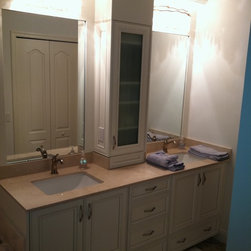 Custom Vanity with premium select raised panel Maple doors. Custom center cabinet with class door for extra storage. All new granite and his and sinks. Vintage white finish with new amerock hardware.