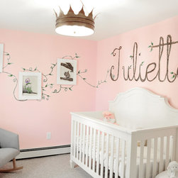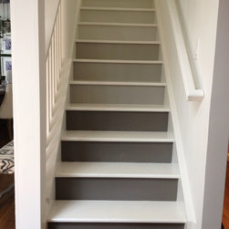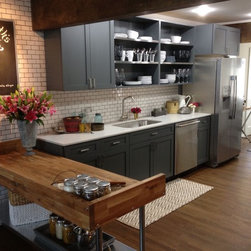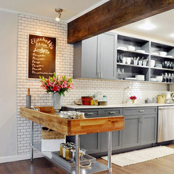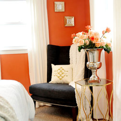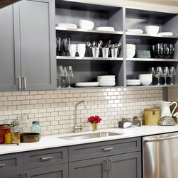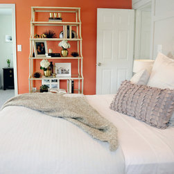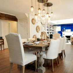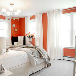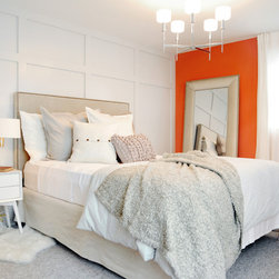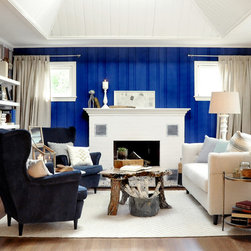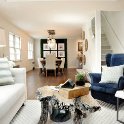 This project was a nearly full-home renovation. Home to a single mom, our first goal was to create a master bedroom that would be a personal sanctuary, with clean white linens, a cozy reading nook, and a fun, punchy wall color. Downstairs, we unified the spaces with a cozy, beachy, modern theme. Gray kitchen cabinets play off the dark grout and white subway tiles; the dining room is outfitted with ample space for entertaining; and the living room is given a modern update with the new focal point being the crisp white fireplace on the blue wall.