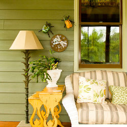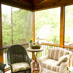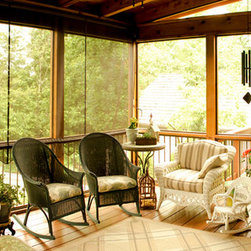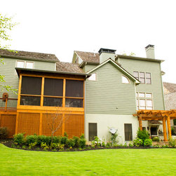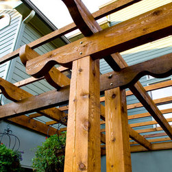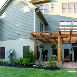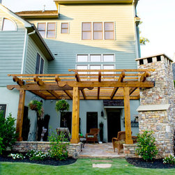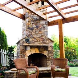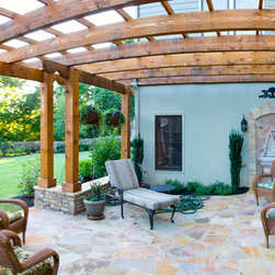 Covered porch with pergola living space on other side. Living space includes a fireplace.