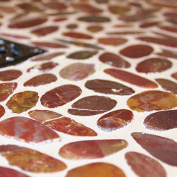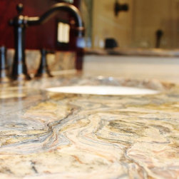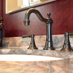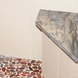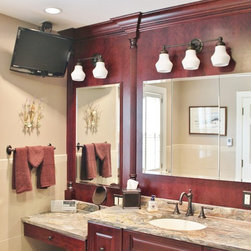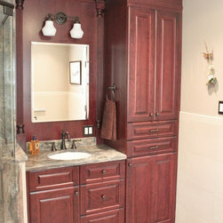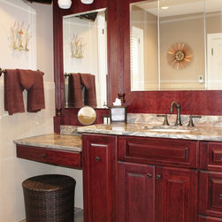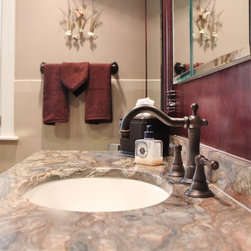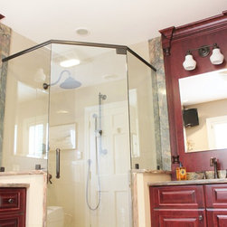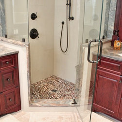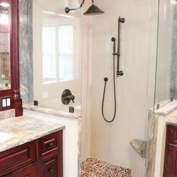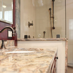 This master bathroom was designed by a collaboration of designers at Baldwin Kitchen & Bath. The bathroom is very unique due to the exotic fusion granite from Brazil. The countertop shows variations in both movement and color to become a true statement piece. The bathroom has a custom neo-angle shower, anchored by custom cabinetry. The custom cabinetry was used to accommodate two separate vanities, a makeup desk, and tower storage. The room features a Toto neorest, to offer the peak of luxury. Porcelain tile surrounds the room and shower, with pebble flooring to accent the shower. The room was completed with Brizo faucets, and Baldwin hardware. The color palette suggests a traditional, yet luxurious feel, perfect for our client’s home.