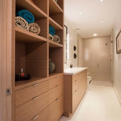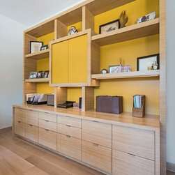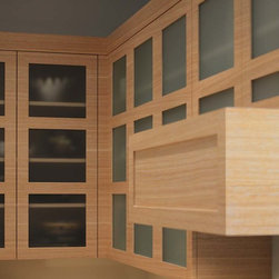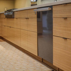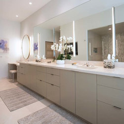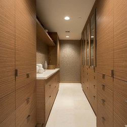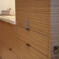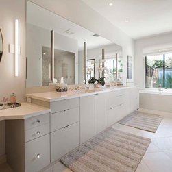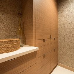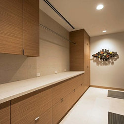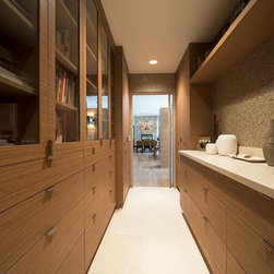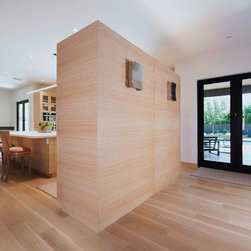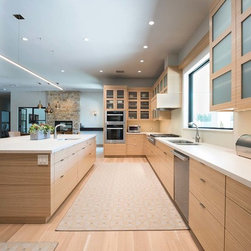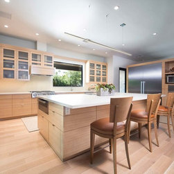 A large bright & airy kitchen featuring a large walk-in pantry brings functional style to this Central Phoenix home. White Rift Oak veneer with a pickled finish was used for the kitchen cabinets and office, and a cleaf 3D laminate was book grain matched and mitered together for an ultra custom look in the pantry, laundry room, and bathrooms.