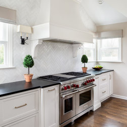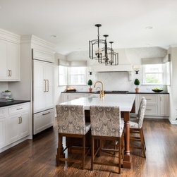This kitchen is soaring to new heights with this gorgeous custom made hood. We took full advantage of the raised ceiling in this part of the kitchen and made the hood a feature. Flanked by wall sconces and corner windows, it's a beautiful backdrop to the rest of the space.