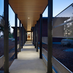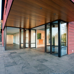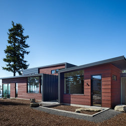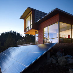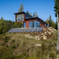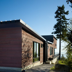 A linear spine organizes the building, defining a progression of interior and exterior spaces that culminates in a panorama overlooking the San Juan Islands. Interior and exterior rooms are separated and defined by metal roofs and walls set on either side of the circulation spine. Water from these roofs is directed to the circulation spine and ultimately to large storage tanks where is it filtered for reuse. The remote site led to a desire for self-sustainability, including water collected from the roofs and power provided from photovoltaic panels set onto the steep topography.