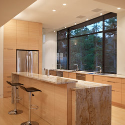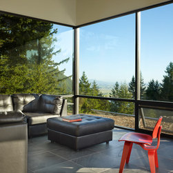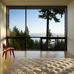This 3200 sf house, completed in 2009, is sited on a forested ridge overlooking the San Juan Islands. Accessed by a steep winding road up Chuckanut Mountain, the structure runs along the northwest edge of a small narrow plateau. Situating the built form along this edge allows for level outdoor space on a site mostly comprised of steep terrain.