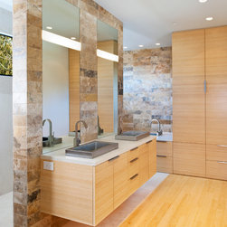 The progression of varied rooms, the programmatic order and material selections were designed in response to the client’s desire for the house to reflect the marriage of their East Asian heritage: one being of Japanese descent the other of Chinese. The ability to accommodate their extended family – including an annual Chinese New Year party they host – was an underlying consideration. Large interior and exterior sliding doors open to significantly change the circulation through and experience of the individual spaces, allowing for either privacy or an integrated plan open to the outdoors.