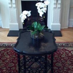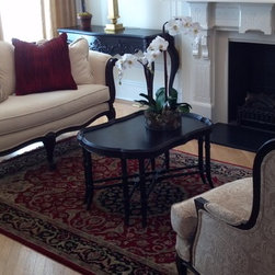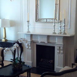 In this living room, I wanted to emphasize the spaces formal attributes - stark white walls, light angled wood floors, and the focal point, the fireplace with wood mantel and moudling. I added some darker accents - ornamental area rug, with red accents, and dark wood coffee table along with two neutral settees. The shining star to this space, other than the intricate fireplace, is the gilded, antiqued, mirror. To make the room feel more complete, added were a gold based lamp, some silver candlesticks, and a floral accent.