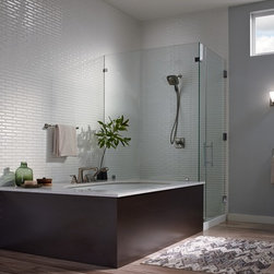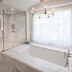 Photo features Anatolia Calacatta in 12 x 24 on the shower and tub wall.