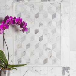 Photo features Anatolia, Calacatta on the bathroom wall accented with the Calacatta Escher Box mosaic in the 12 x 12 and the Calacatta Pencil 1/2 x 12. The bathroom counter features Calacatta 12 x 12 honed marble.