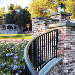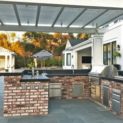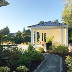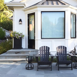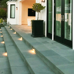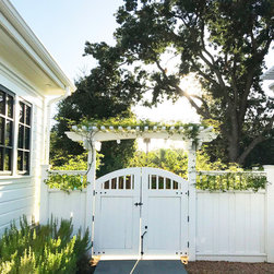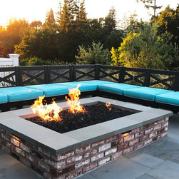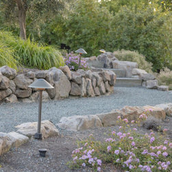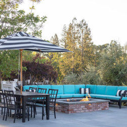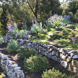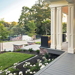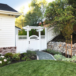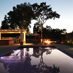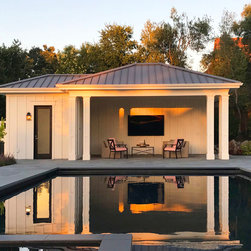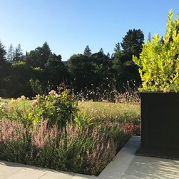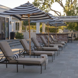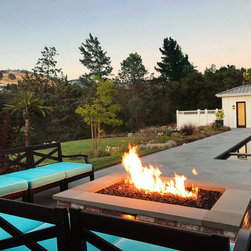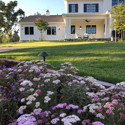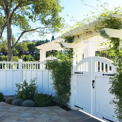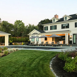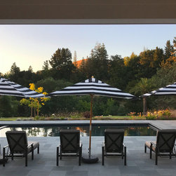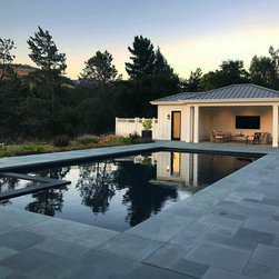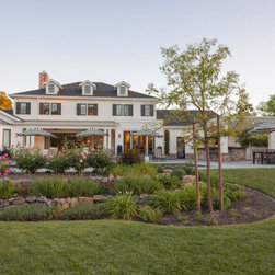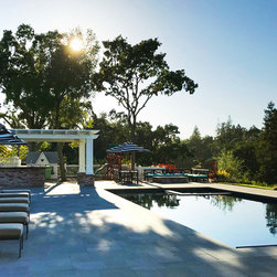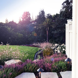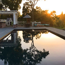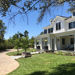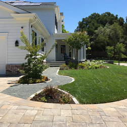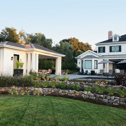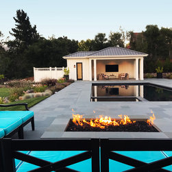 This project was a beautiful collaboration between J.Montgomery Landscape Architects and the Architect remodeling the house and cabana structure. The original 1928 Art Deco home underwent its own transformation, while we designed the landscape to perfectly match. The clients wanted a style reminiscent of a Country Club experience, with an expansive pool, outdoor kitchen with a shade structure, and a custom play area for the kids. Bluestone paving really shines in this setting, offsetting the classic Sonoma-style architecture and framing the contemporary gas fire pit with its blue accents. Landscape lighting enhances the site by night for evening gatherings or a late-night swim. In front, a bluestone entrance leads out to paver driveway and styled front gate. Plantings throughout are Water Efficiency Landscape certified, accenting the front hardscape and back terraces with beautiful low-water color.