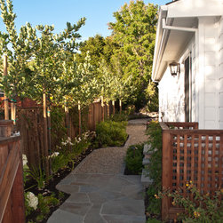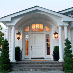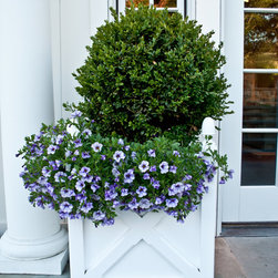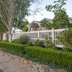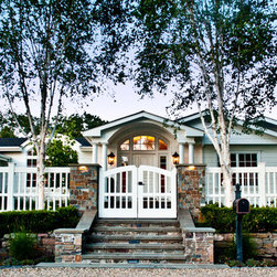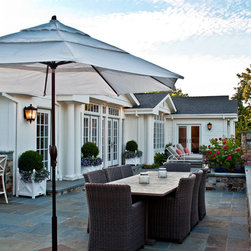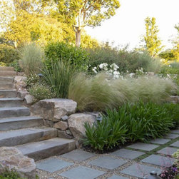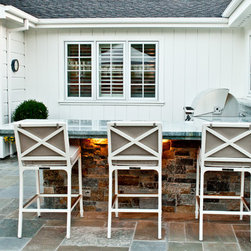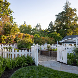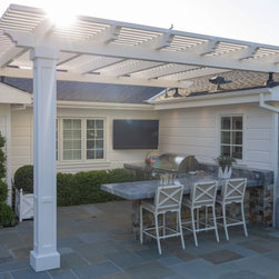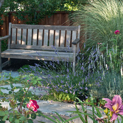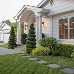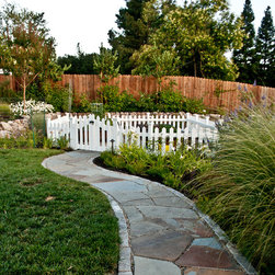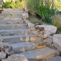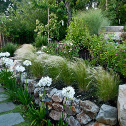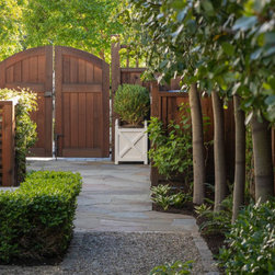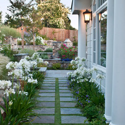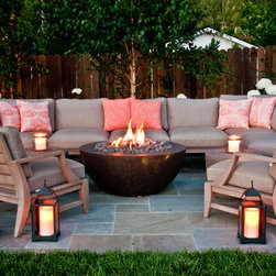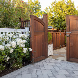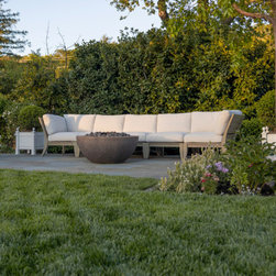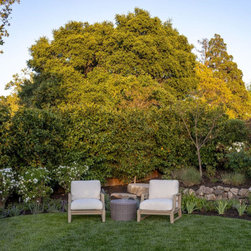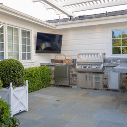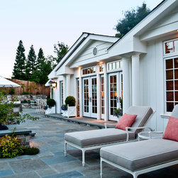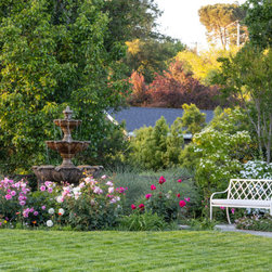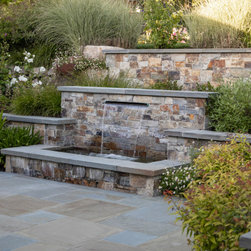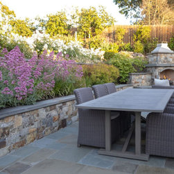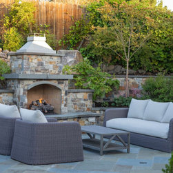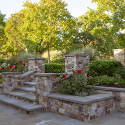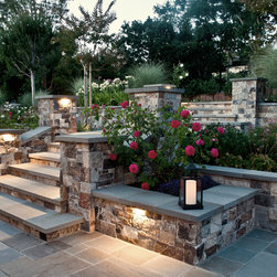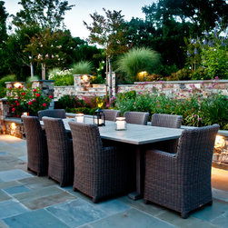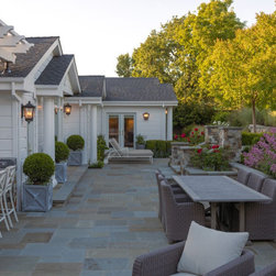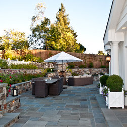 We were asked to create something really special for one of our most admired clients. This home has been a labor of love for both of us as we finally made it exactly what she wanted it to be. After many concept ideas we landed on a design that is stunning! All of the elements on her wish list are incorporated in this challenging, multi-level landscape: A front yard to match the modern traditional-style home while creating privacy from the street; a side yard that proudly connects the front and back; and a lower level with plantings in lush greens, whites, purples and pinks and plentiful lawn space for kids and dogs. Her outdoor living space includes an outdoor kitchen with bar, outdoor living room with fireplace, dining patio, a bedroom-adjacent lounging patio with modern fountain, enclosed vegetable garden, rose garden walk with European-style fountain and meditation bench, and a fire pit with sitting area on the upper level to take in the panoramic views of the sunset over the wooded ridge. Outdoor lighting brings it alive at night, and for parties you can’t beat the killer sound system!