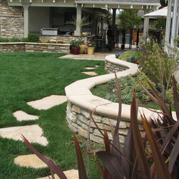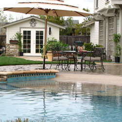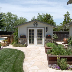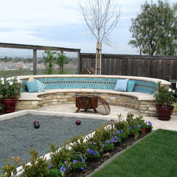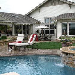 This project began as a blank slate in a new home development. The homeowners wanted the ultimate backyard for entertaining friends and family, as well as providing a fun hangout for their two children. This backyard has a little something to make everyone happy. A covered loggia connects the house with the outdoor kitchen and fireplace, providing a convenient place to prepare dinner and drinks while chatting with guests cozied up by the fire. The curving pool is great for kids with its shallow beach entry. Adults can relax in the spa that overlooks the vineyards and rolling hills of the Livermore Valley. The bocce ball court provides a little friendly competition, and the curving bench seat at the end offers another place to socialize and warm up by the fire pit. Finally, the “garden shed” is anything but – the homeowners use it as a place for the kids to host sleepover parties. Eventually it can be turned into an office or guest house when the kids are grown.