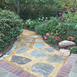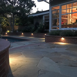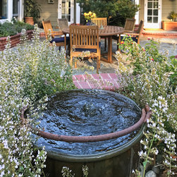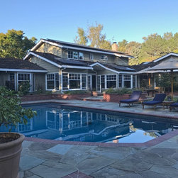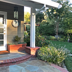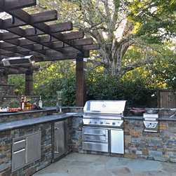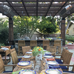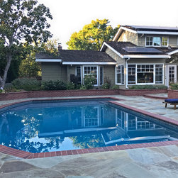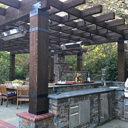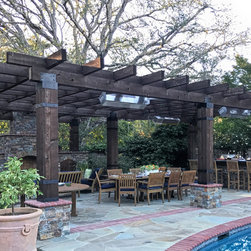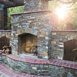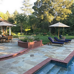 This transitional landscape became a welcoming outdoor living space for clients for whom family time and poolside gatherings were priority. The custom-shaped pool and patio with brick trim radiate casual charm, and the natural wood pergola will shade many a summer dinner fresh from the outdoor kitchen. Flowers and herbs abound in the whimsical garden, and a garden patio with fire pit is the perfect evening retreat. Our secret favorite part? The stone fireplace that fits into the pergola. What a great spot to sit and chat late into the night, any time of the year!