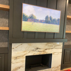 Fireplace surround is dolomite, a dramatic natural stone. Batten board details above, custom stained shelves with modern flare in the wallpaper
