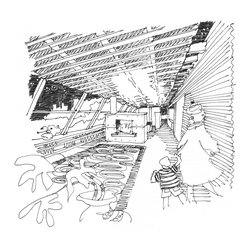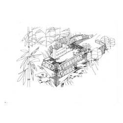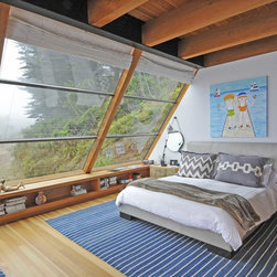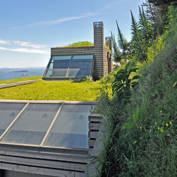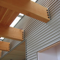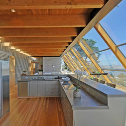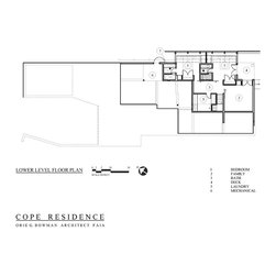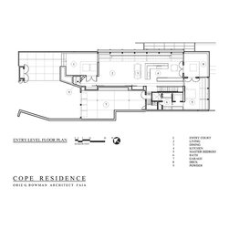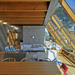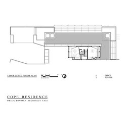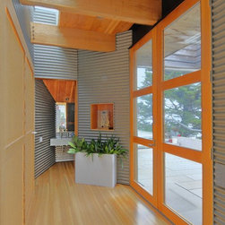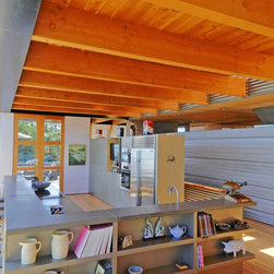 The three levels of the 4000 SF house/770 SF garage step down the hillside approximating the natural slope. The garage, living areas, and master bedroom are on the entry level with kids’ bedrooms and family room on the lower level and two offices on the upper most level. Predominant orientation is easterly requiring a strategy to prolong the amount of direct sunlight reaching the interior. Sloping much of the glazing back overhead to capture noon and early afternoon direct sunlight resulted in chamfered forms which help the house visually connect with the site as do the flat earth covered roofs. Living/dining/kitchen backlighting is provided via a long narrow skylight above a westerly reflecting wall of corrugated sheet metal and two ventilation chimneys bleed off excess heat from the interior.