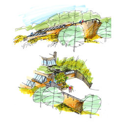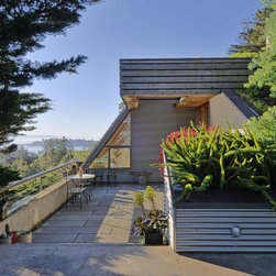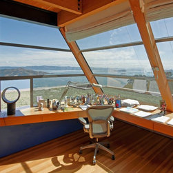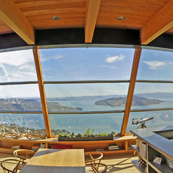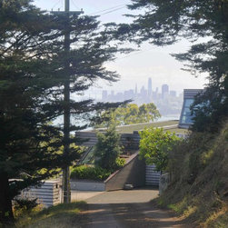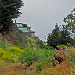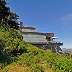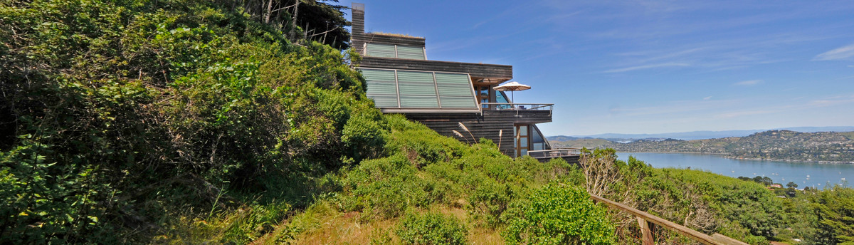 This hillside residence sits on a very steep, constrained, and visually sensitive lot at the edge of the open space at the Marin headlands just north of the Golden Gate Bridge. Summer fog is common, but on clear days there are panoramic views of Tiburon to the north, the entire expanse of San Francisco Bay to the east, and the city to the south. Substantial retaining and support walls were necessary for vehicle access and fire engine turn around requirements and combined to essentially determine the location and footprint of the house.