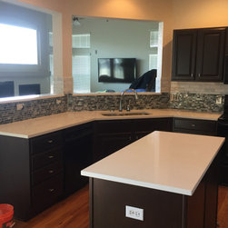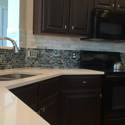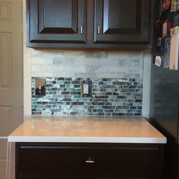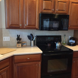 Kitchen after remodel. All we did was enlist the assistance of our wonderful painter, who worked his magic on the cabinetry. New counter tops update the kitchen and make it more valuable and easy to maintain. The color of the backsplash enhances and goes beautifully with the color of the cabinetry.