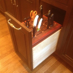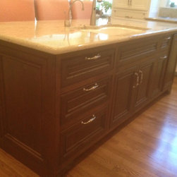 Custom alder wood island with distressed English Chestnut finish. Rear supports angle for easier passage through kitchen.