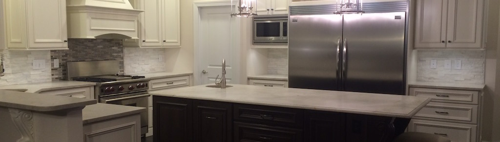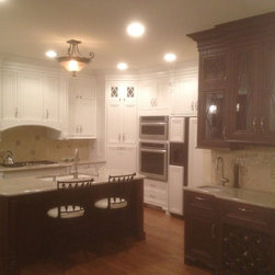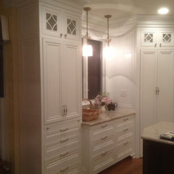 Custom kitchen painted Sherwin Williams Pure White, Island and hutch is distressed alder with an English Chestnut finish.