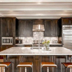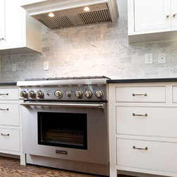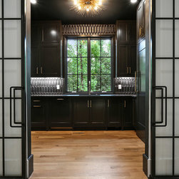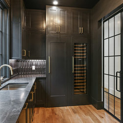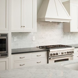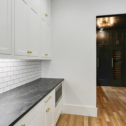 Custom pigmented Lacquer kitchen, Honed black absolute tops, Carrera subway backsplash