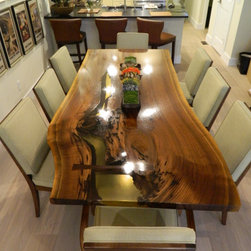 The client wanted a unique and elegant table for dining. We found a beautiful piece of natural wood and hired an artist to fill in the void with epoxy and stitch the sides together with beautiful contrasting keys. The table base (not seen) was made out of cold rolled steel sheeting with a natural finish and placed such that the base cannot be seen through the clear epoxy finish. Is it floating?
