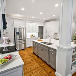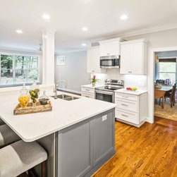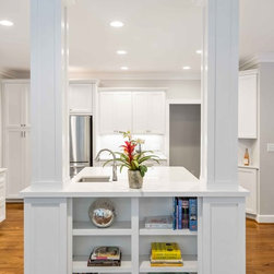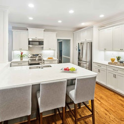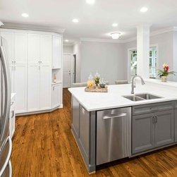 An addition was needed to make this kitchen be its best. It now opens to a new family room, with views of the new pool out the window. The island provides seating for meals and homework. White cabinets on the perimeter keep this interior kitchen bright. The gray island makes a fresh design statement.