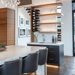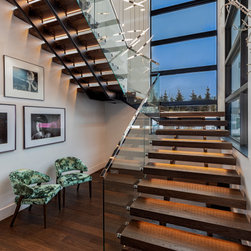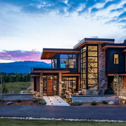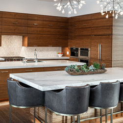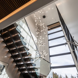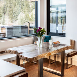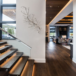 Inside, an open floor plan creates a large main-floor living space, naturally lit by floor-to-ceiling windows throughout and incorporating textures like a wood slat ceiling and horizontal grain slab doors. A DaVinci fireplace warms the great room, featuring herringbone inset wood floors, flowing seamlessly into the dining space and finally a gourmet kitchen with a breakfast nook, 2 marble islands and horizontal grain walnut cabinetry. In addition to a master suite with walkout to the board-formed concrete patio, hot tub and dog run, a first floor powder room completes the main floor.