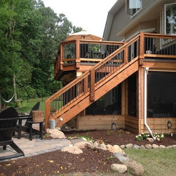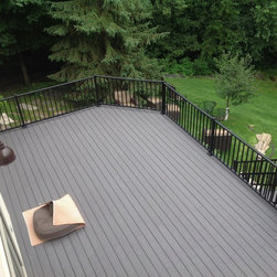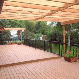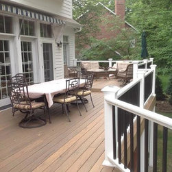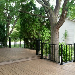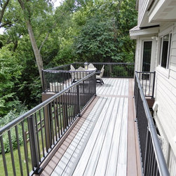Beautiful 2 level Timbertech deck with Westbury Railing. Riser lights add ambiance and safety. Photo Courtesy of Outdoor Solutions, Inc.