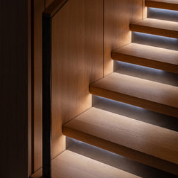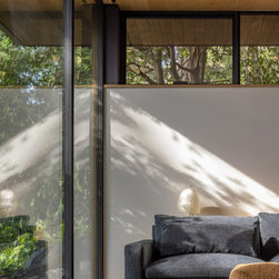 Throughout the home, carefully curated moments enhance both daily rituals and larger gatherings. A reading and TV nook balances intimacy with framed views, while the reimagined main suite—perched above the landscape—provides a serene, spa-like retreat. Every space is designed to respond to its surroundings, whether capturing morning light through clerestory windows or opening wide to evening breezes off the water. A restrained interior palette of white oak and mild steel brings warmth and clarity, while a sophisticated, customizable lighting system subtly transforms the home’s atmosphere from day to night.