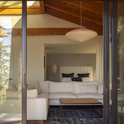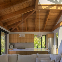 Inside, the warren of small, enclosed rooms was reconfigured into spaces that breathe with light and landscape. The home retains its original layered hip roofs, but now celebrates their horizontality with carefully composed vertical window divisions and a refined material palette of thermally modified wood and cementitious siding. Heavy stone elements that previously blocked key sightlines have been replaced with glass, framing layered views of water, treetops, and gardens. Large sliding doors dissolve the boundary between indoors and out, extending the living space onto an expansive deck and pool terrace.