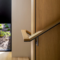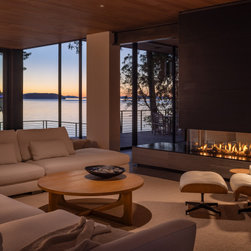 Sustainability was integral to the design. A high-performance building envelope, roof-mounted solar array, and geothermal system—anchored by drilled piles beneath the garage—ensure year-round efficiency. The site was also carefully reconsidered, replacing rigid barriers with a more natural flow: a newly designed entry sequence welcomes guests through the landscape, a covered path connects the house to the garage, and a thoughtfully planned garden links the home to the waterfront beyond.
