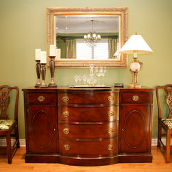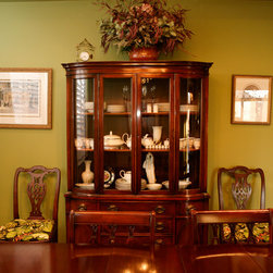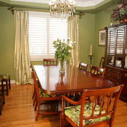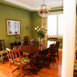 This is a traditional dining room with a bit of tropical flair reflected in the fabric on the seats as well as the nice green colour. Crown molding was added, which draws your eye up to the recessed ceiling.