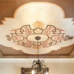 This client's ceiling is stenciled with metallic paints, crystal brush, and metallic cremes. The walls are glazed with multiple layers of custom tinted scumble.