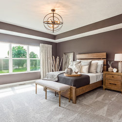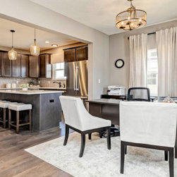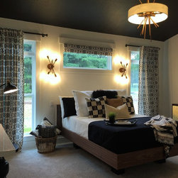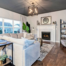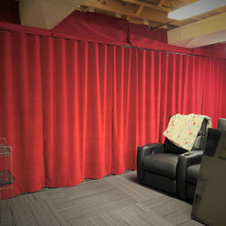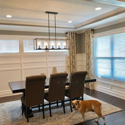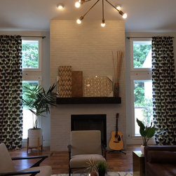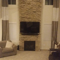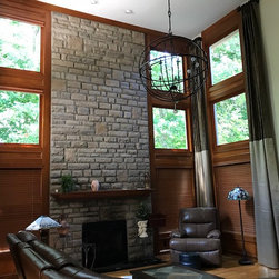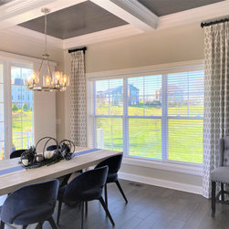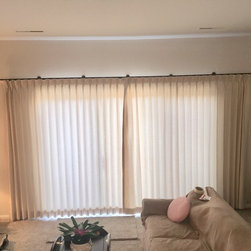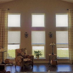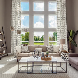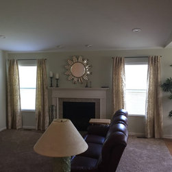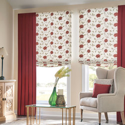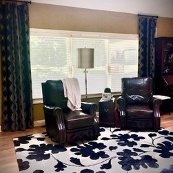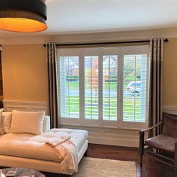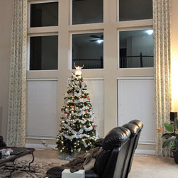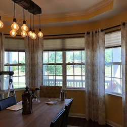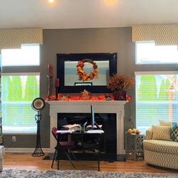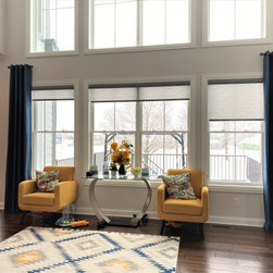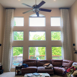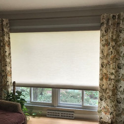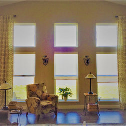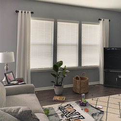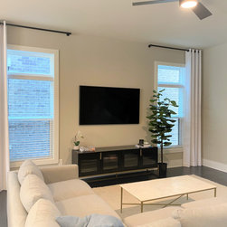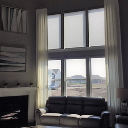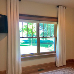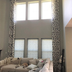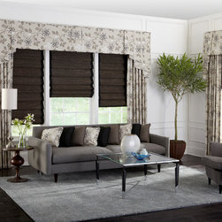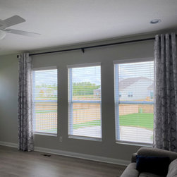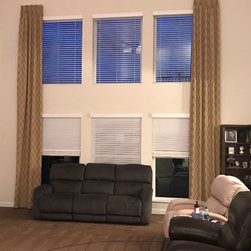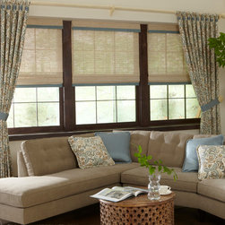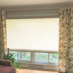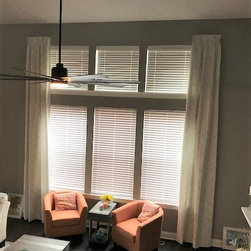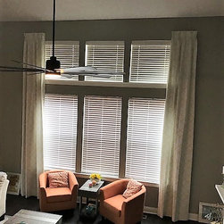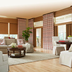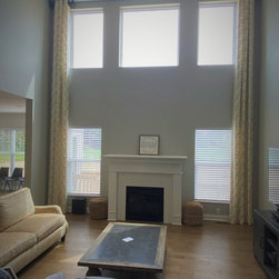 This family room has functional motorized wood blinds complimented with decorative side panels