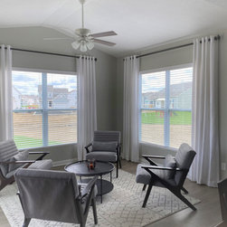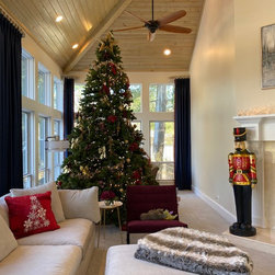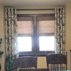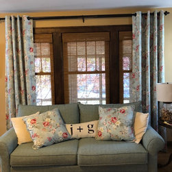 beautiful family room with draperies, wooden woven roman shades and complementing door sliders and coordinating pillows