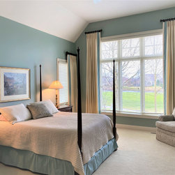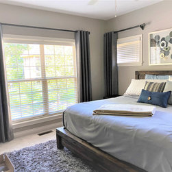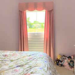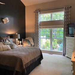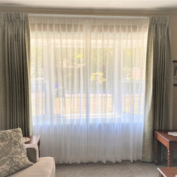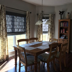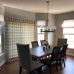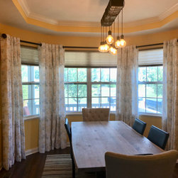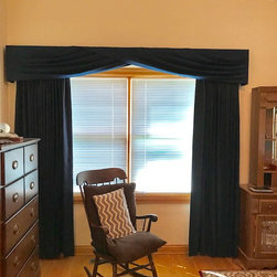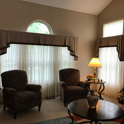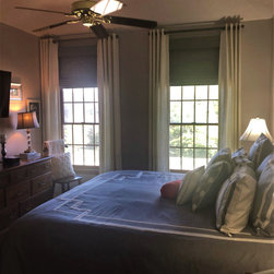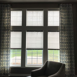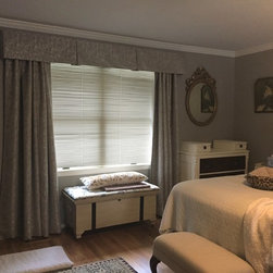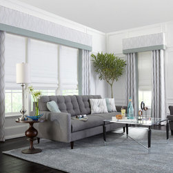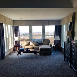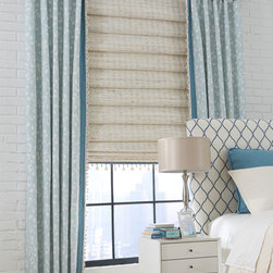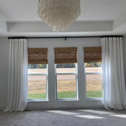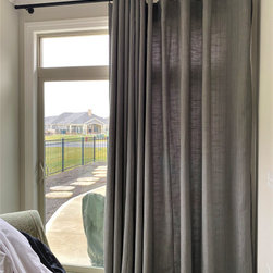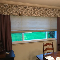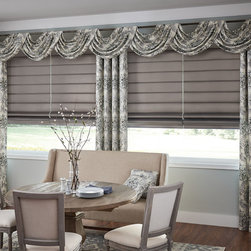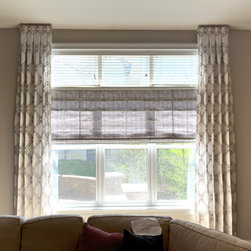elegant linen drapery with coordinating fabric valance and complementing fabric roman shades with room darkening liner