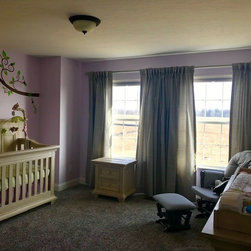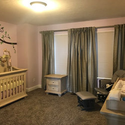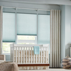 an elegant nursery with honeycomb shades and coordinating linen draperies on a beautiful window hardware