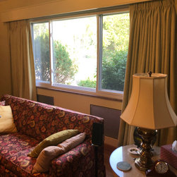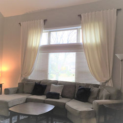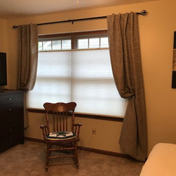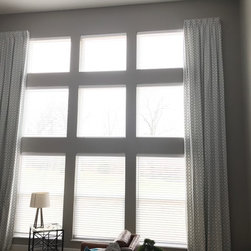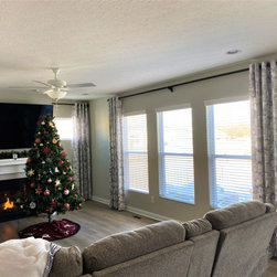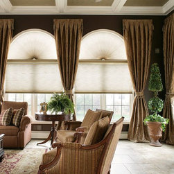 beautiful family room with draperies, cellular shades and complementing tiebacks