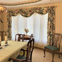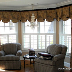 beautiful bay with with draperies, fabric roman shades, a valance with a decorative trim and coordinating pillows and seat cushions
