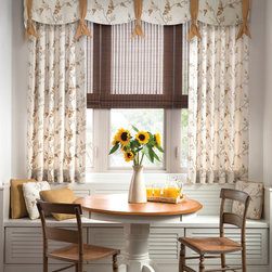 beautiful window seat trimmed in linen draperies, complementing valance and accented with wooden roman shades
