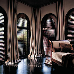 elegant linen draperies with a puddle style and coordinating wooden shutters