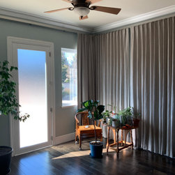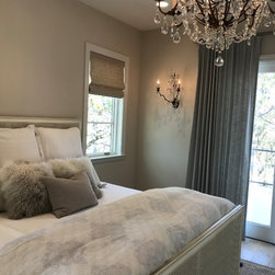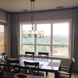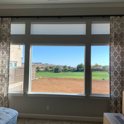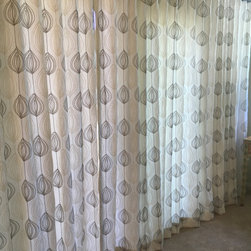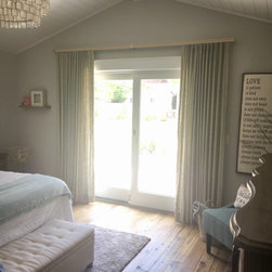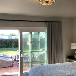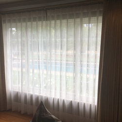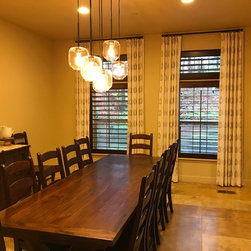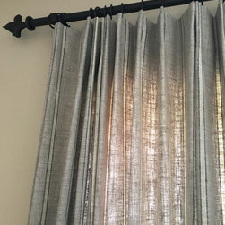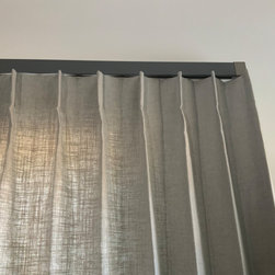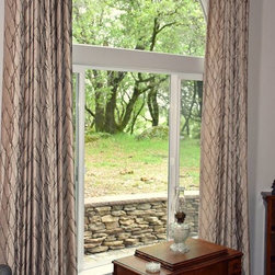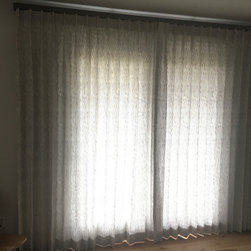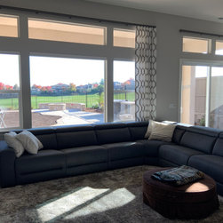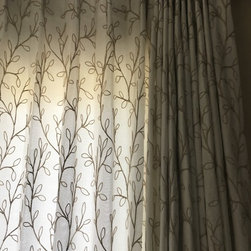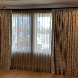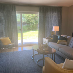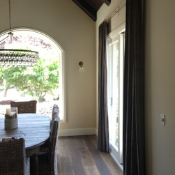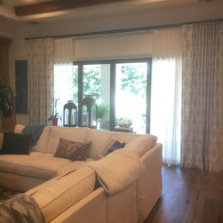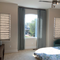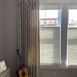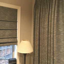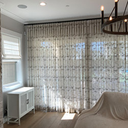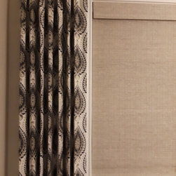 Casual elegance and light filtering functionality achieved with Motorized Natural Woven Shades and Lovely pleasted drapery.