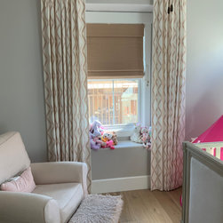 Little Girls Room with Blackout Woven Wood Shades and Pink Patterned Drapery